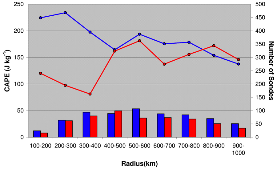Mean CAPE (with entrainment and fusion) as a function of radius for the upshear (red line) and downshear (blue line) quadrants. The number of dropsondes in each quadrant is shown by the bars.