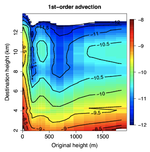 Log-10 of the elements of the transilient matrix for deep convection. This shows that the boundary-layer parcels detraining in the troposphere (between 2 and 14 km on the y axis) come primarily from the first 100 meters of the boundary layer (0 to 100 meters on the x axis).