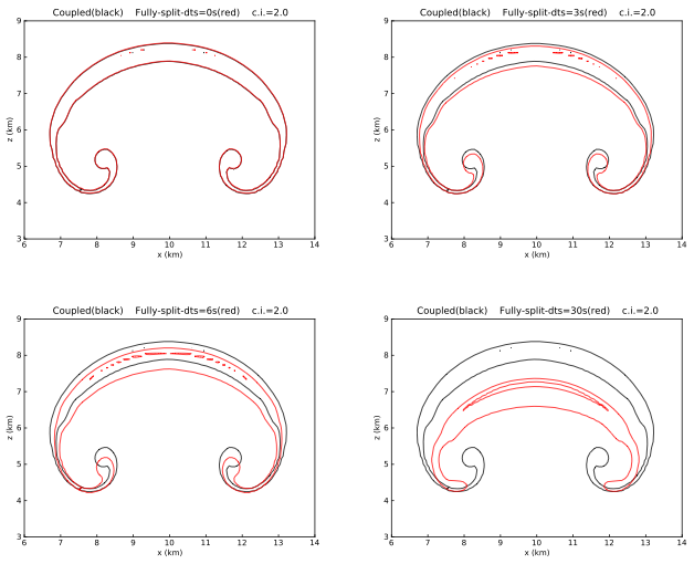 Temperature (2-K contours) for a moist bubble in two dimensions integrated numerically in four different ways. The black contours show the benchmark simulation. The red contours show the results obtained with different time steps for updating the phase transitions, with a maximum time step of 30 seconds in the lower-right panel.