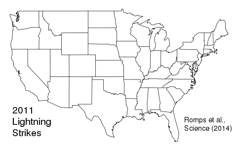 Lightning plays an important role in atmospheric chemistry and in the initiation of wildfires, but the impact of global warming on lightning rates is poorly constrained. Here, we propose that the lightning flash rate is proportional to the convective available potential energy (CAPE; a measure of how explosively clouds can rise) times the precipitation rate. Using three independent observational data sets (one for CAPE, one for precipitation, and one for lightning), the product of CAPE and precipitation explains 77% of the variance in the time series of total cloud-to-ground lightning flashes over the contiguous United States (CONUS). The figure above shows an animation of the lightning data during June, July, and August of the year studied.