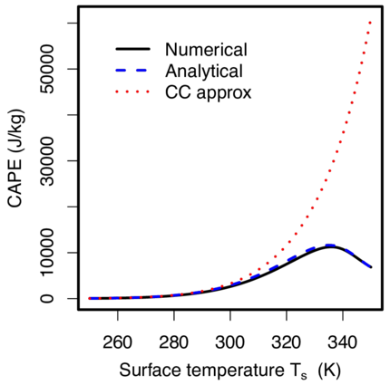 The dependence of CAPE on surface temperature Ts for radiative-convective equilibrium (RCE). (black solid) Numerical calculation of CAPE, which exhibits Clausius-Clapeyron (CC) scaling at surface temperatures at and below about 310 K. (blue dashed) The full analytical expression for CAPE, which matches the numerical calculation for all surface temperatures. (red dotted) The approximate analytical expression for CAPE, which incorrectly predicts CC scaling at very warm temperatures.