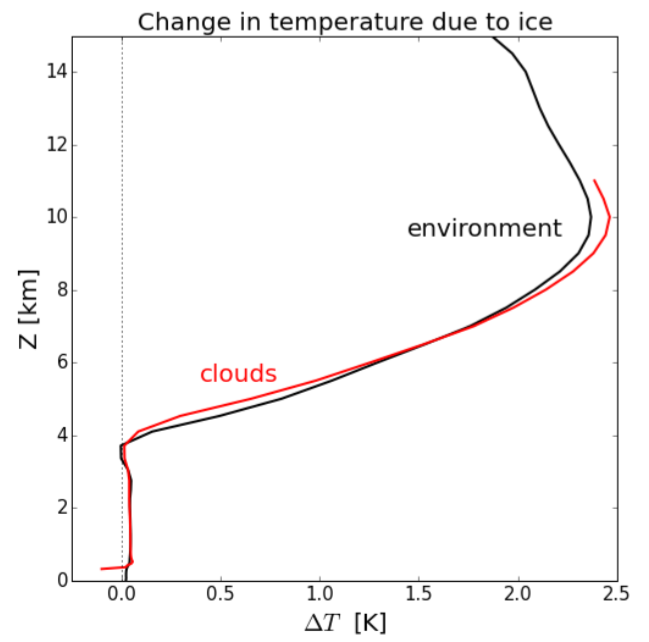 The temperature difference between a world "with ice" and a world "without ice" for (red) clouds and (black) the environment. Ice increases the temperature of clouds in the upper troposphere due to the latent heat of fusion, but the environment adjusts accordingly to ensure that the average cloud continues to have very little buoyancy.