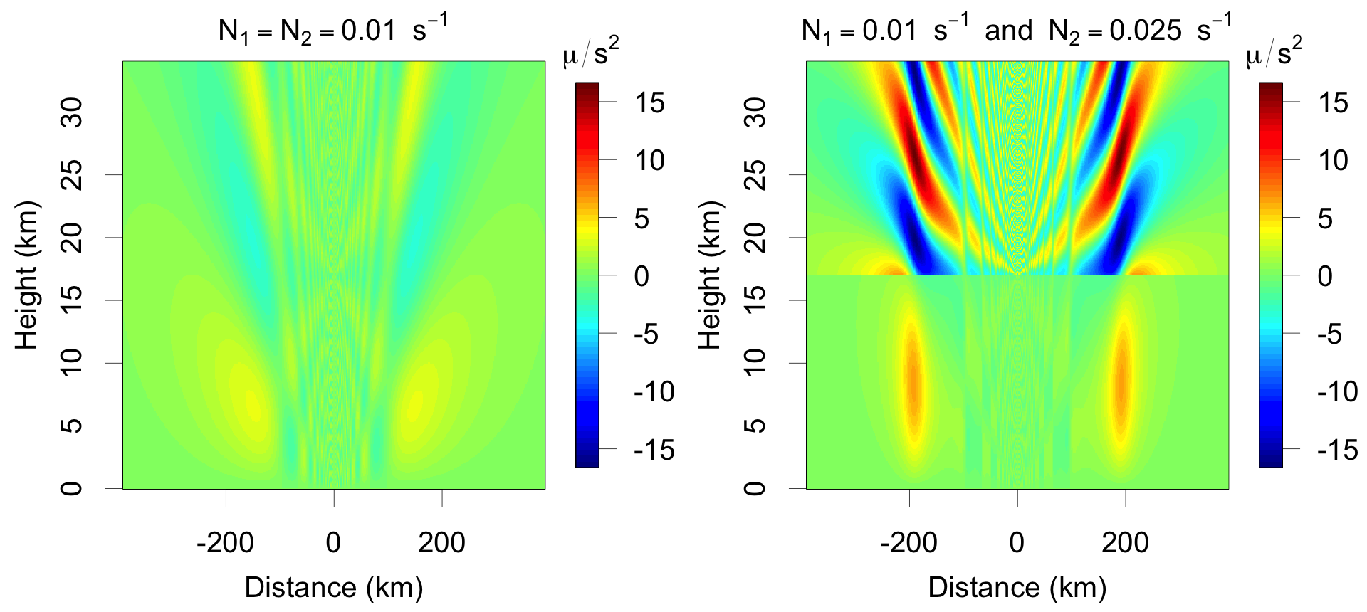 The buoyancy one hour after a first-baroclinic heating is applied to the troposphere at x=0 in a 2D Boussinesq fluid with (left) no change in stratification at 15 km and (right) a 2.5-fold increase in stratification at 15 km.