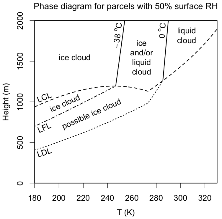 For surface air with a relative humidity of 50 percent, the heights of the lifting condensation level (LCL; where saturation with respect to liquid water occurs), the lifting deposition level (LDL; where saturation with respect to solid ice occurs), and the lifting freezing level (LFL; where aerosols freeze homogeneously).