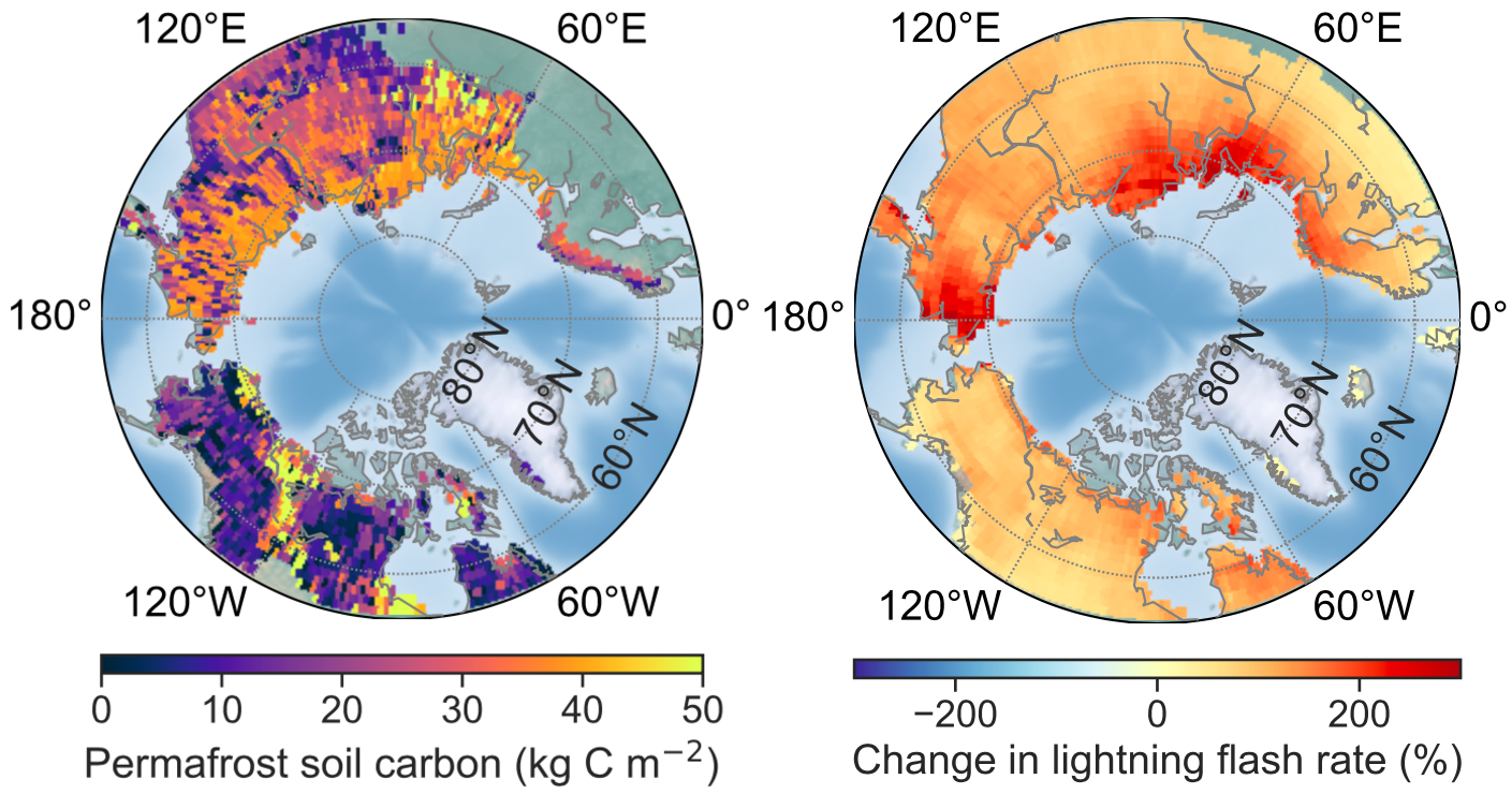 (left) The distribution of permafrost soil carbon. (right) The fractional increase in lightning projected for this century. The increase in lightning over areas of high permafrost carbon will accelerate the release of carbon to the atmosphere, accelerating warming.