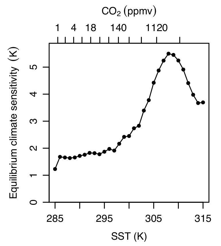 Equilibrium climate sensitivity (ECS) in cloud-resolving simulations of tropical RCE at 1-K sea-surface-temperature (SST) intervals.