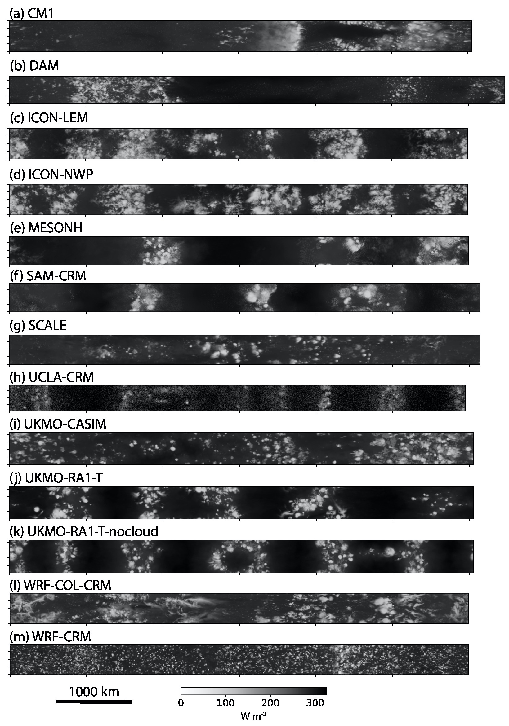 Snapshots of high cloud (as seen through top-of-atmosphere radiative flux) from 13 different cloud-resolving models simulating RCE in a channel domain.