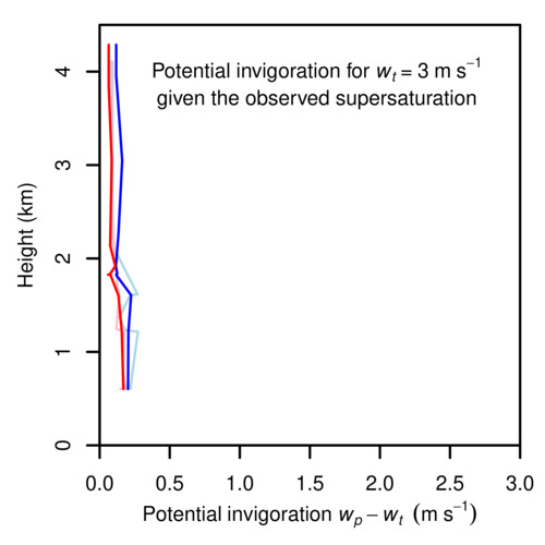 Vertical profile of the maximum velocity boost that could be generated by air pollution for a 3-m/s updraft with the supersaturation values observed in convecting clouds over the Amazon. The large blank white space is intentional: the x axis ranges from 0 to 3 m/s (the typical speed of the observed updrafts), while the maximum theoretical invigoration is only about 0.2 m/s or less. The two colors correspond to two sets of instruments aboard the aircraft: (blue) CIP+CAS and (red) CIP+CDP. The fainter profiles are calculated only for the days when the air was deemed by the field-campaign scientists to be "clean" or "marine".