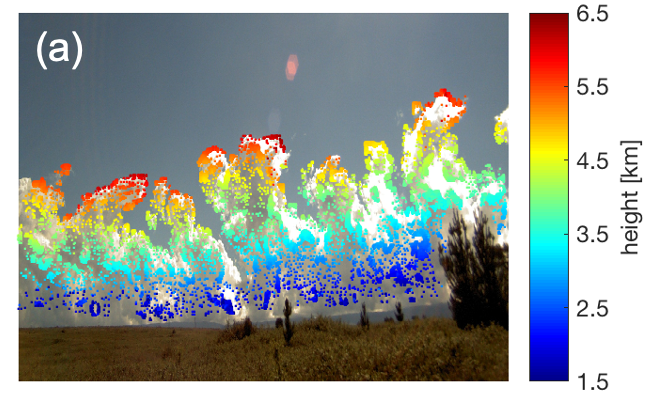 The clouds developing over the Sierras de Cordoba as seen by one of the ARM Stereo Cameras. Color-coded squares indicate the height of that part of the cloud, as obtained from the Point Cloud of Clouds Points Product developed at LBNL.