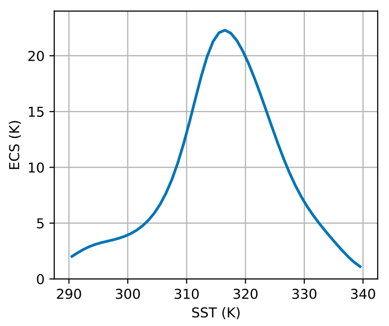 The "bump" in equilibrium climate sensitivity (ECS) probed with 51 equilibrated climate simulations, which were made possible by the rapid equilibration technique.