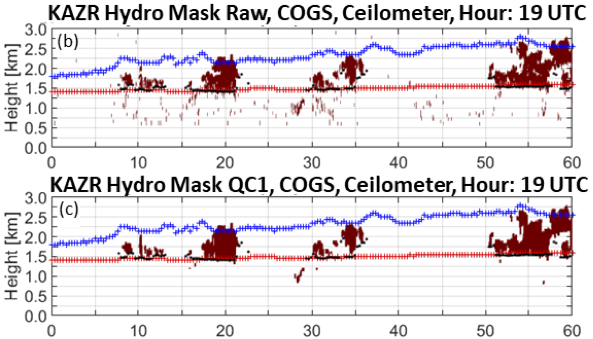 (top) The red and blue plus signs show the minimum and maximum heights of clouds as detected by COGS. The maroon color indicates where the radar is reporting cloud. Note that there are many detections outside of the COGS range; these are insects. (bottom) Same, but after passing the radar data through Dr. Williams' new algorithm. The radar's reports of cloud are now much more consistent with COGS.