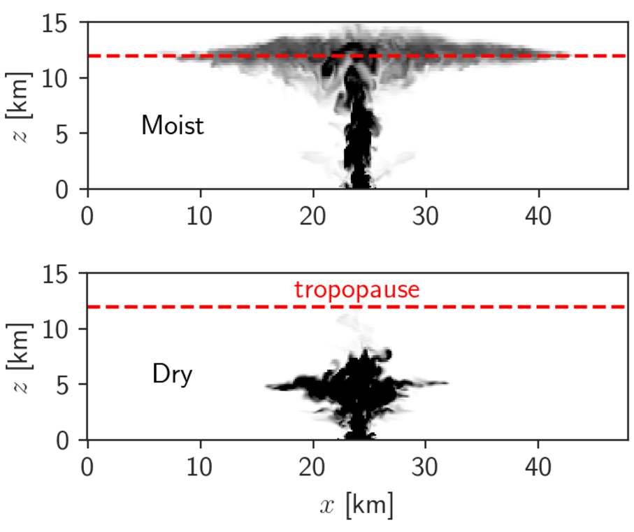 Comparison of (top) moist and (bottom) dry simulations based on the dry simulation of Reisner et al. (2018). Soot cross sections are evaluated at the end of simulations and in the center of the domain. The moist simulation has 70% relative humidity. As in Reisner et al. (2018), the dry simulation does not get soot above the tropopause, while the moist simulation does.