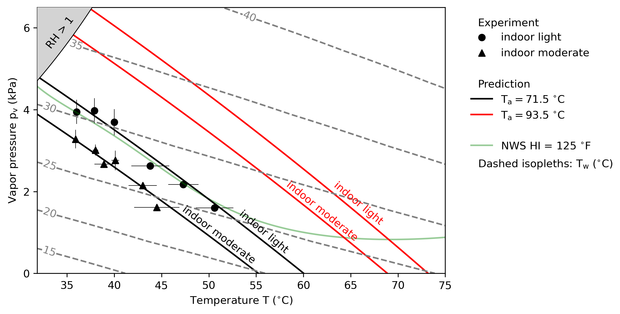 (black symbols) Empirical combinations of temperature and vapor-pressure that cause hyperthermia (the core temperature rising above about 37 °C) with an indoor wind speed. Light exertion is shown with circles and moderate exertion is shown with triangles. Each symbol represents an average of multiple subjects and the error bar represents the standard deviation. (black curves) Constant apparent temperature of 71.5 °C, corresponding to hyperthermia, with the indoor wind speed and light or moderate exertion. (red curves) Same as black curves, but with a constant apparent temperature of 93.3 °C, which leads the core temperature to equilibrate at a fatal value of 42 °C. (dashed contours) Isopleths of wet-bulb temperature. (light green curve) The 125 °F isopleth of the National Weather Service's polynomial approximation to the heat index, which exhibits unphysical behavior and matches the "indoor light" points only by coincidence as discussed in the paper.
