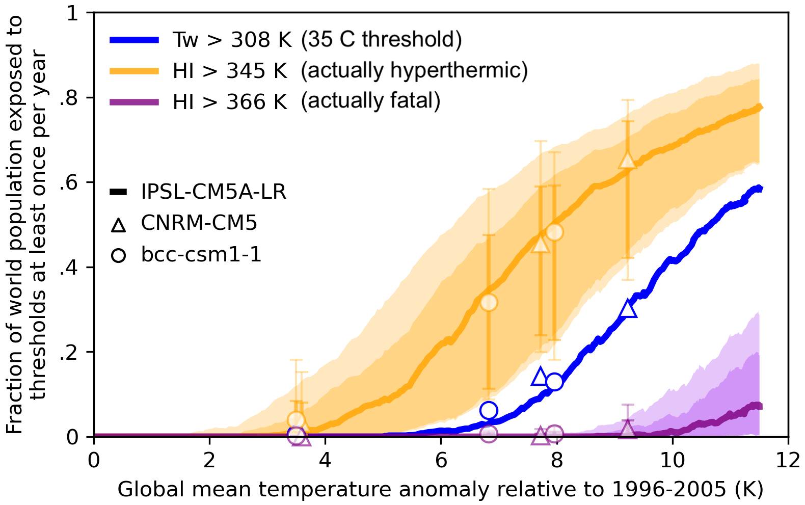 The fraction of the 2005 world population experiencing three criteria: wet-bulb temperatures greater than 308 K (blue), heat index greater than 345 K (hyperthermic; orange), and heat index greater than 366 K (fatal; purple) as functions of the global-mean temperature anomaly relative to 1996-2005. The curves plot these fractions for the IPSL-CM5A-LR simulation of RCP8.5 scenario from 2006-2300, inclusive. A ten-year-window averaging is applied to each year smooth the curves. The symbols have the same meaning as the curves, but are calculated using the CNRM-CM5 (round) and the bcc-csm1-1 (triangle) simulations, averaged over the last ten years of the 21st, 22nd and 23rd centuries. The light shadings and the thin error bars are the spreads due to a range of metabolic rates of 50-300 W/m2, and the dark shadings and thick error bars are the spreads due to a range of windspeed of 1-4 m/s.