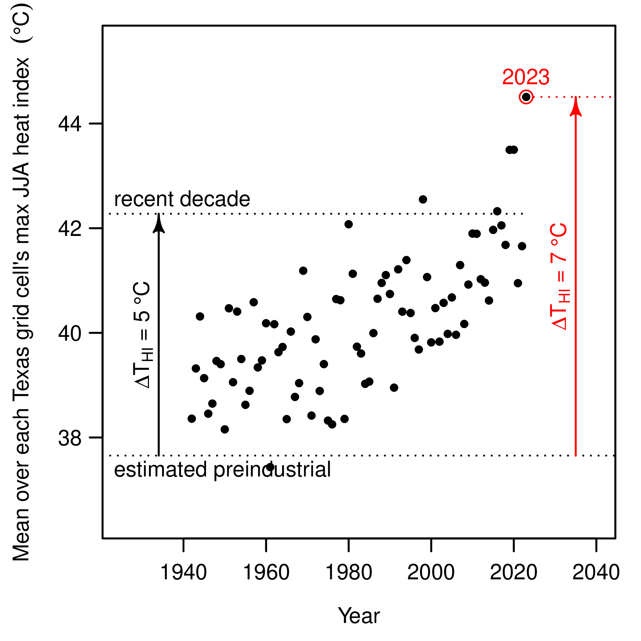 For every year, the spatial average over Texas of the local maximum heat index in degrees Celsius (note that 5 °C is about 9 °F and 7 °C is about 13 °F). The top dashed line marks the mean of the data points 2014-2023. The lower dashed line marks the estimate of the preindustrial value.