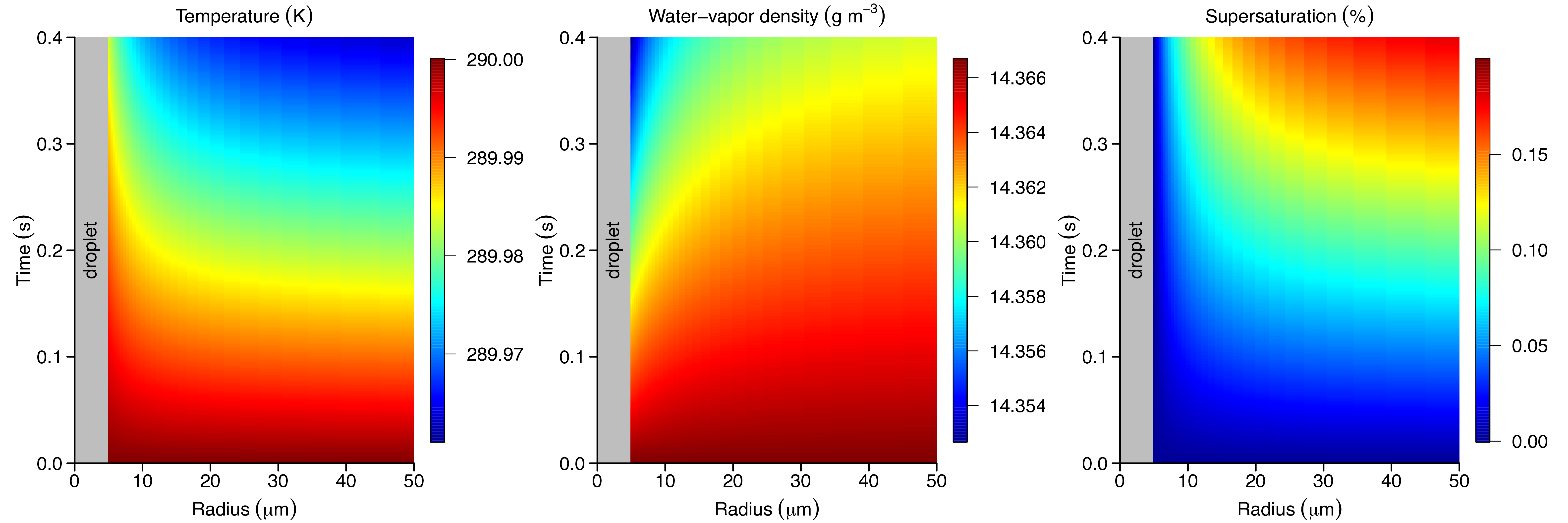 Zooming into the vicinity of a droplet in a cloud that is ascending at 10 m/s, the (left) temperature, (middle) water-vapor density, and (right) supersaturation within 50 microns of the droplet's center for the first 0.4 seconds of ascent. The cloud is initialized with a monodisperse distribution of droplets with a 5-micron radius, a liquid mass fraction of 10-5, a pressure of 90 kPa, a temperature of 290 K, and zero supersaturation.