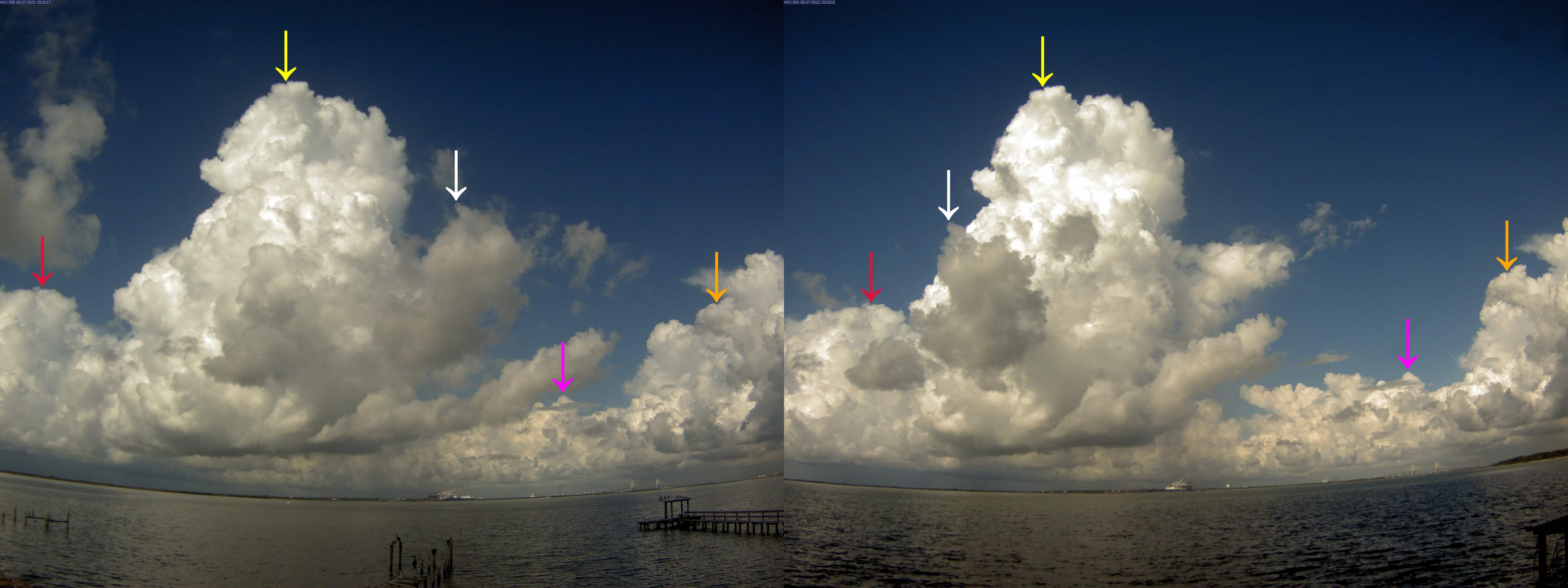 Images from the (left) left and (right) right stereo cameras taken at 15:15:20 UTC on August 27, 2022 during the TRACER campaign. Colored arrows have been added to draw attention to a sample of five feature points (among hundreds) matched between the two images.